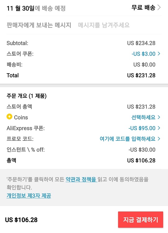 카드 쿠폰과 스토어 쿠폰은 중복으로 적용한 모습인데요 알리익스프레스 쿠폰과 프로모션 코드는 중복이 되지 않아서 적용할 수 없었습니다.