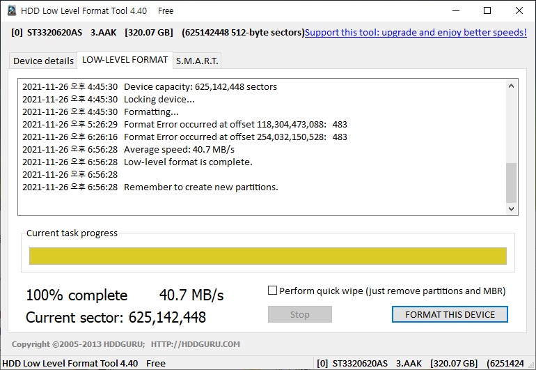 로우 포맷은 굉장히 오래 걸립니다. 요즘 사용하기에는 매우 작은 320G 용량이지만 수 시간이 소요된 것 같네요