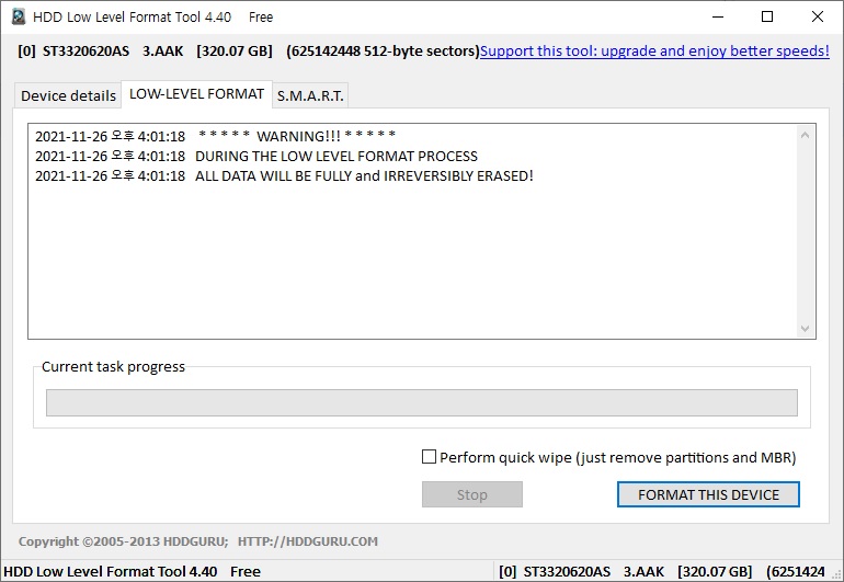 로우 포맷은 굉장히 오래 걸립니다. 요즘 사용하기에는 매우 작은 320G 용량이지만 수 시간이 소요된 것 같네요