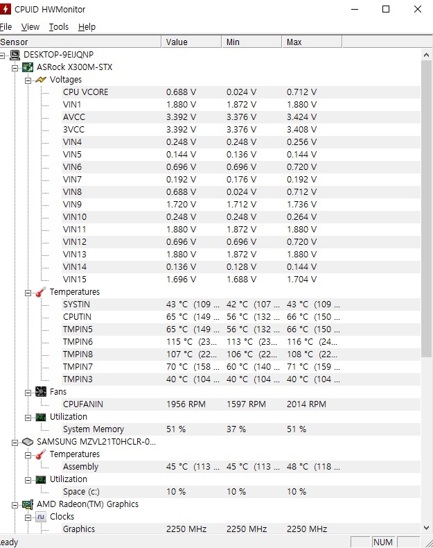 미니 PC 답게 온도도 감당할 수 없는 수준으로 치솟았고 쿨러도 2000 RPM을 넘어 굉장한 소리를 내네요.