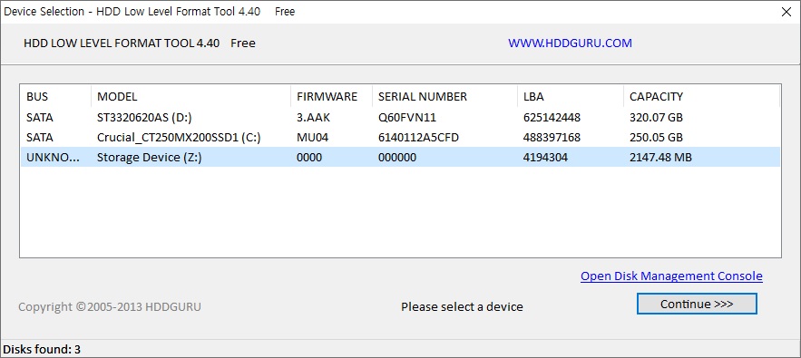 로우 포맷 툴을 설치 후, 포맷하고자 하는 드라이브를 정확하게 선택해주세요.