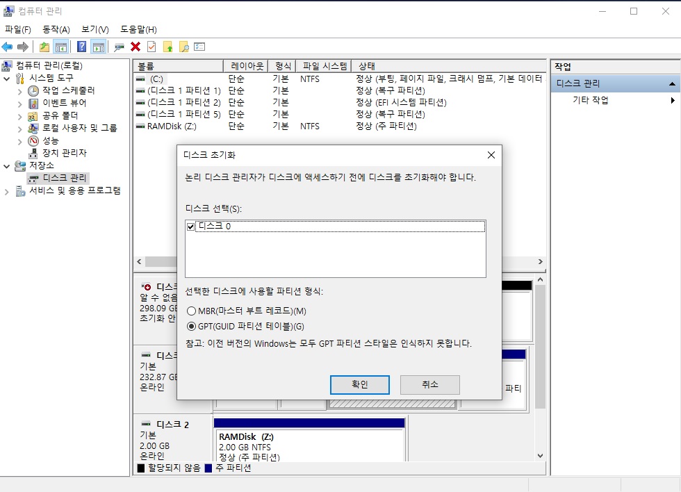 그다음으로는 디스크 관리자에 가서 해당 드라이브를 초기화 후 할당을 해주면 끝입니다.