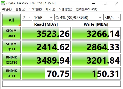 PCIE 3.0이지만 거의 최대 속도로 뽑아준 것 같습니다. 이정도면 만족입니다.