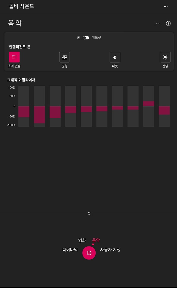 Dolby atmos 상세 설정에서 이퀄라이저가 사라졌습니다.