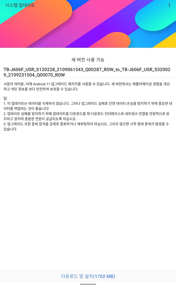 안드로이드 버전이 10에서 11로 바뀌는 만큼, 펌웨어 업데이트에는 시간이 꽤나 소요됐습니다.