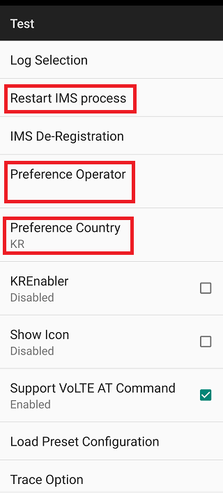 Test를 누르고 국가에 KR, 통신사에 SKT/KT/LGU/OPEN 중 해당하는 통신사를 수동으로 입력하고 IMS 재시작, 예를 누른 뒤 15초 정도 비행기 모드 혹은 USim을 제거해줍니다.