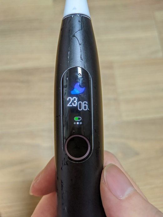 Oclean X부터는 기기에 OLED 스크린이 탑재되어 실시간으로 화면을 보고 터치가 가능하며 배터리, 현재시간, 양치방법, 세기 등을 확인 가능합니다.