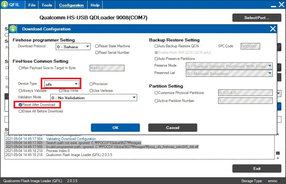 3. 구성 버튼을 누르고 아래와 같이 ufs, Reset After Download를 선택해줍니다