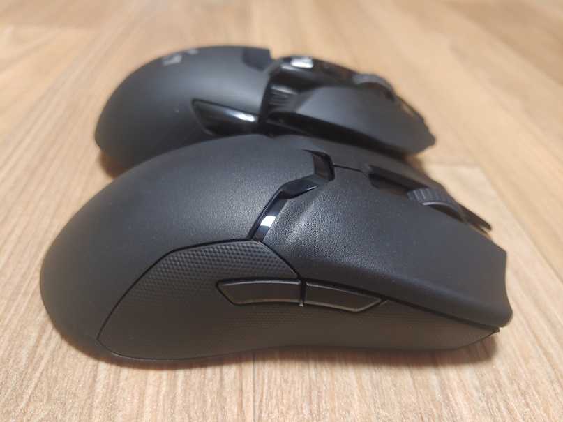 위에서 보면 크기가 거의 비슷해 보이지만, 옆에서 보면 역시나 G903 Hero가 엉덩이 쪽이 두툼한 모습입니다.