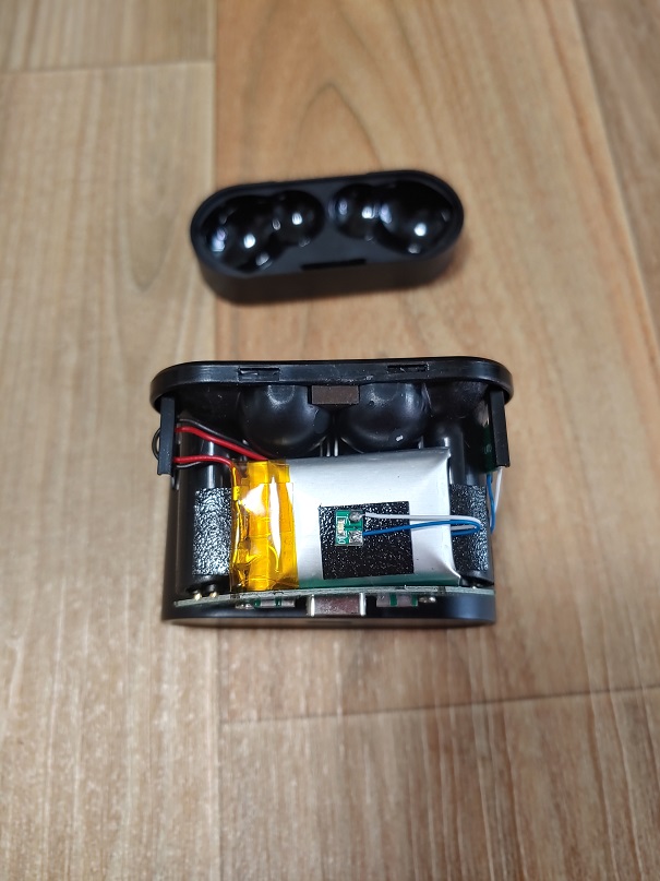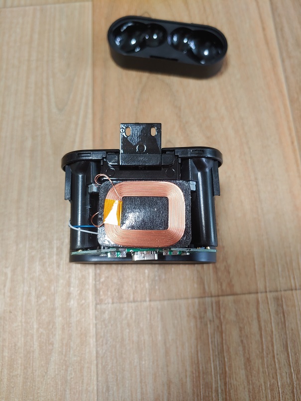 케이스의 빈 공간에 무선충전 모듈과 배터리가 앞뒤로 위치한 모습입니다.