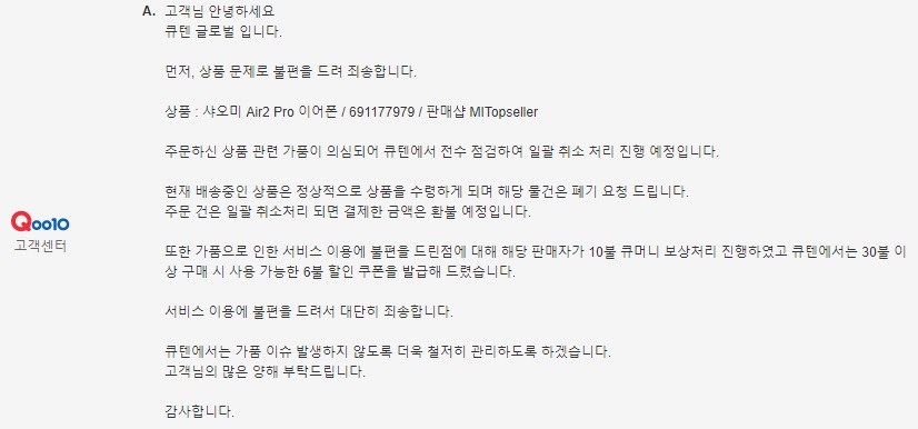 또한 큐텐에서는, 해당 주문 건 전체 일괄 취소하고 환불한다고 하며